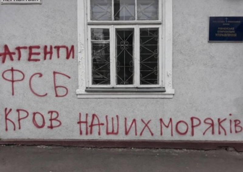 Пока в Стамбуле идет заседание синода Константинопольского патриархата, будущие его прихожане готовят почву для встречи «святого Томоса». В Ровенской области неизвестные исписали здание епархиального управления надписями: «Агенты ФСБ. Кровь моряков на ваших руках», - обвинив УПЦ в содействии нападению на украинские корабли в Азовском море.