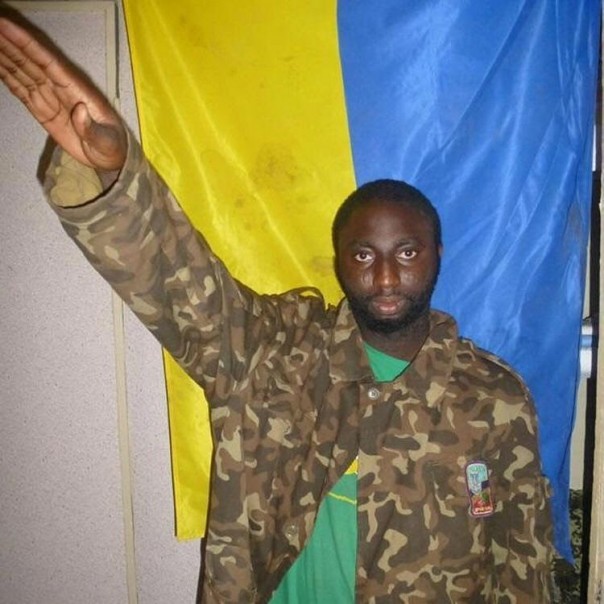 На фотографиях можно отчетливо разглядеть чернокожих людей, одетых в украинскую военную форму Вооруженных сил Украины (ВСУ). Некоторые даже делают нацистское приветствие на фоне желто-голубого флага Украины.