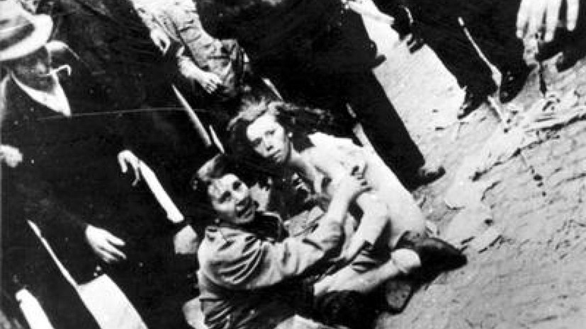 Львов, Украина, июль 1941 года. Еврейские женщина и девочка подвергаются издевательствам со стороны украинских погромщиков