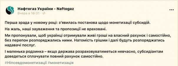 «Первая "зрада" в новом году: появилось постановление о монетизации субсидий. К сожалению, наши замечания и предложения не учтены. Мы предлагали, чтобы украинцы получали живые деньги на свой счет и самостоятельно, без преград распоряжались ими. Зато деньгами и дальше будут распоряжаться поставщики услуг. И маленькая изюминка – если государство будет рассчитываться не вовремя, то субсидиантам придется оплачивать полный счет самостоятельно».