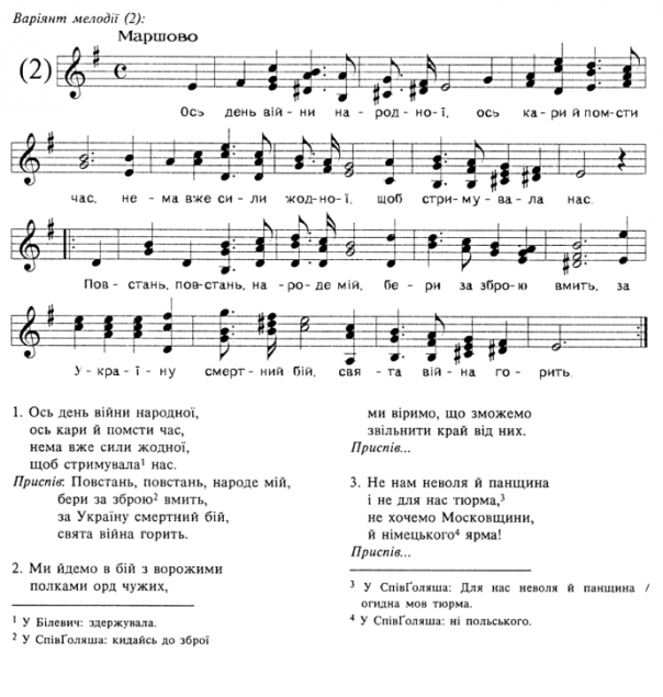 Музыкальной основой созданной во время Великой Отечественной войны песни «Священная война», авторами которой являются поэт Василий Лебедев-Кумач и композитор Александр Александров, якобы послужила песня украинских повстанцев под названием «Восстань, народ мой».