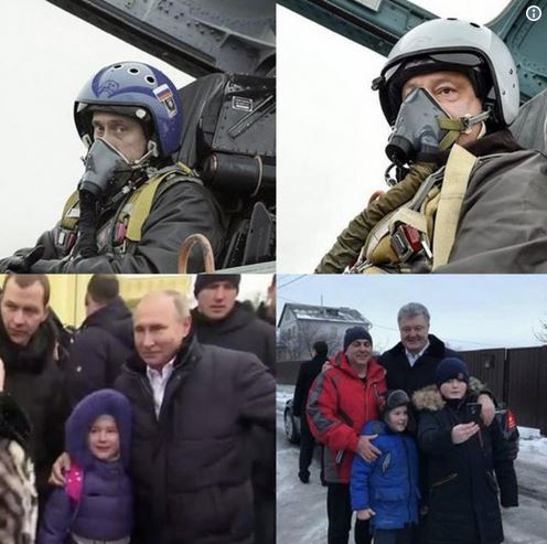Президент Украины Петр Порошенко перед выборами начал активно подражать российскому лидеру, заметил в среду блогер Максим Кононенко. Он опубликовал в своем Twitter серию фотографий, на которых Порошенко, как и ранее Путин, сидит в кабине боевого самолета, фотографируется с детьми.