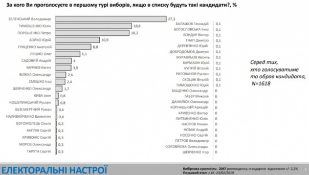 Среди определившихся с выбором и готовых принять участие в голосовании за Зеленского готовы отдать свои голоса 27,3% опрошенных, за лидера партии “Батькивщина” Юлию Тимошенко – 18,8%, за президента Петра Порошенко – 18,2%.