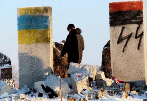 Через месяц на восстановленном мемориале появилась нарисованные красная свастика и чёрный тризуб. А на стелах с фамилиями жертв преступления надписи: «Смерть ляхам!» и «Вон с Украины!».