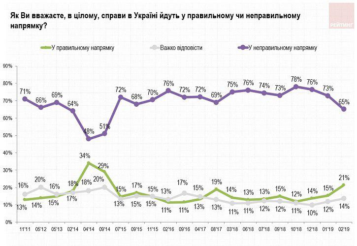 «По результатам опроса, проведенного Социологической группой «Рейтинг» в феврале 2019 две трети опрошенных считают, что дела в Украине идут в неправильном направлении, в то же время каждый пятый считает, что – в правильном (с начала года последний показатель вырос с 14 до 21%)», – отмечает в релизе.