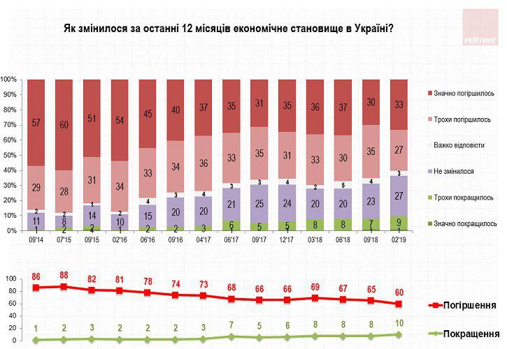 «Только 10% считают, что за последние 12 месяцев экономическое положение в Украине улучшилось, 60% – почувствовали ухудшение. Важно заметить, что за последние 5 лет последний показатель уменьшился с 86 до 60%, одновременно возросло число респондентов, которые считают, что ситуация не изменилась (с 11 до 27%)», – говорится в отчете.