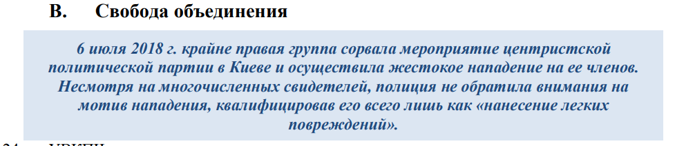 УВКПЧ отмечает, что значительное число нападений, как утверждается, совершают правые радикалы. При этом миссия выражает озабоченность в связи с тем, что в большинстве случаев такие преступления остаются безнаказанными.