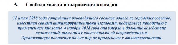 "Эти нападения создали атмосферу запугивания, которая производит сдерживающее воздействие на способность и готовность людей открыто говорить о вопросах общественной значимости, прежде всего – выражать свое несогласие с политикой или опасения относительно политики", - указано в докладе.