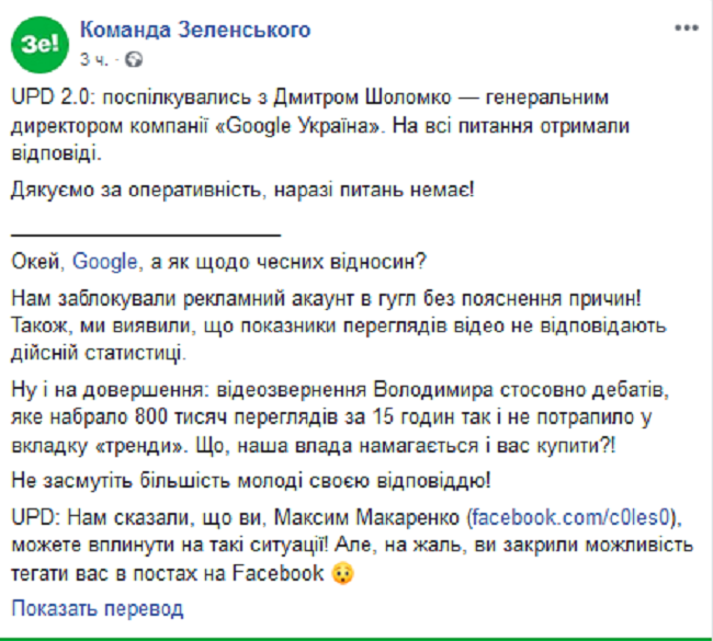 Позже у Зеленского добавили, что после общения с генеральным директором компании «Google Україна» Дмитрием Шоломко вопрос разрешился. Источник