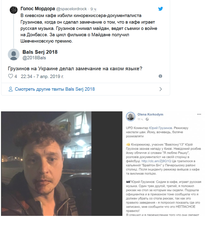 В киевском кафе избили кинорежиссера-документалиста Грузинова, когда он сделал замечание о том, что в кафе играет русская музыка. Грузинов снимал майдан, ведет съемки о войне на Донбассе. За цикл фильмов о Майдане получил Шевченковскую премию.