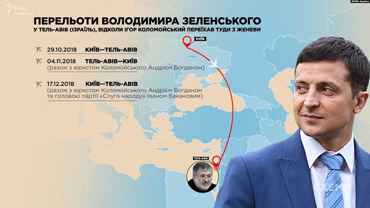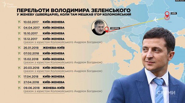 Два года назад лидер украинской избирательной гонки Владимир Зеленский не менее одиннадцати раз совершал авиаперелёты в Женеву, когда там жил украинский олигарх Игорь Коломойский, а после того, как тот перебрался в Израиль летом 2018 года, Зеленский летал ещё дважды в Тель-Авив.