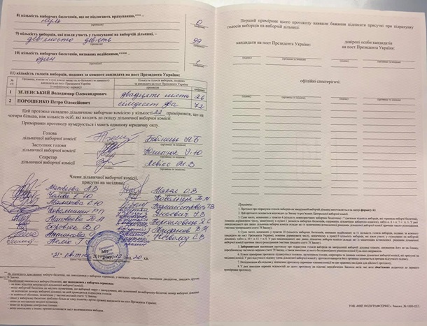Петра Порошенко поддержали 72 избирателя, Владимира Зеленского - 26. Один бюллетень признан недействительным.
