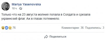 "Молния ударила в металлический штырь, на котором был закреплен флаг. Стяг упал. Все длилось буквально пару секунд, но грохот был такой, будто снаряд взорвался. Даже не сразу поняла, что случилось", - рассказала очевидец Ирина Комлыкова.