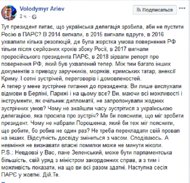 В свою очередь заявление Зеленского, что не в его силах было повлиять на возвращение России в ПАСЕ, прокомментировал в Facebook глава украинской делегации, нардеп от Блока Петра Порошенко Владимир Арьев.