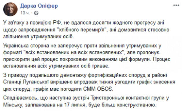 Об этом на своей странице в Facebook сообщила пресс-секретарь представителя Украины в ТКГ, второго президента Леонида Кучмы Дарка Олифер, обвинив в срыве договорённостей Россию.