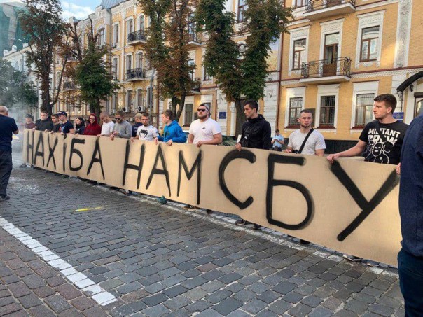 Горстка националистов развернула плакат «Нахiба нам СБУ?», после чего были брошены пара дымовых шашек и зажглось несколько файеров, которые с удовольствием во всех ракурсах запечатляли фотокорреспонденты.