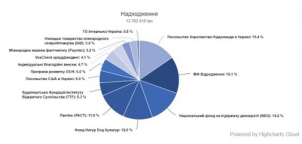 По результатам 2018 года, основную долю пропитания «независимым аналитикам» обеспечили: Международный фонд «Возрождение» (финансируется Джорджем Соросом) – 15,1%, Национальный фонд демократии (NED, основан Конгрессом США) – 14,2%, посольство Королевства Нидерланды в Украине – 15,4%, некий фонд Natur&Kultur (Германия) – 12,0% и прочие «большие друзья» Украины.
