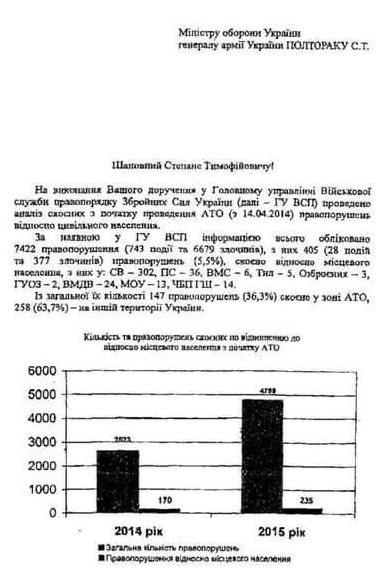 Во исполнение Вашего поручения, в Главном управлении Военной службы правопорядка Вооруженных Сил Украины (далее – ГУ ВСП) проведен анализ совершенных с начала проведения АТО (с 14.04.2014) правонарушений в отношении гражданского населения.