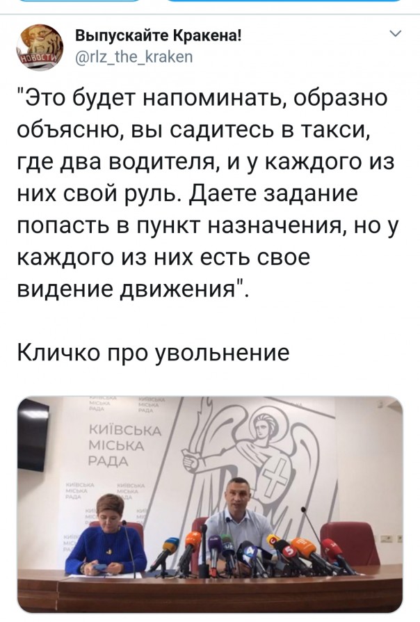 "Два человека будут соревноваться, кто из них имеет большее влияние. Это будет напоминать, образно объясню, вы садитесь в такси, где два водителя, и у каждого из них свой руль. Даете задание попасть в пункт назначения, но у каждого из них есть свое видение движения. Убежден, что такой автомобиль доедет только до ближайшего перекрестка", - отметил мэр.