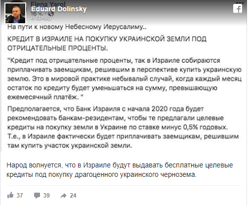 Пока Верховная рада обсуждала отмену моратория, в социальных сетях Украины появились фейковые сообщения о том, что Банк Израиля с начала 2020 года будет стимулировать выдачу ссуд на приобретение украинской земли под отрицательный процент: минус 0,5% годовых.