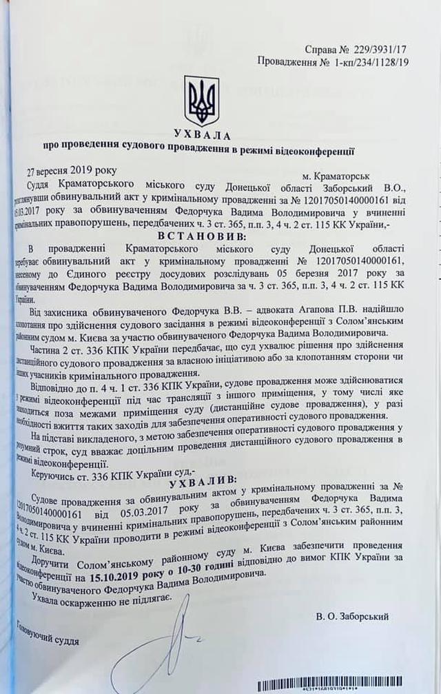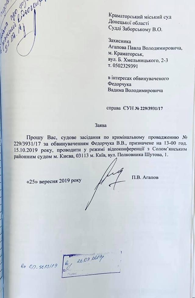 Дружковский городской суд, также расположенный на временно оккупированной части Донецкой области, два года бесконечно переносил заседания, на которые майор СБУ Федорчук не приезжал. Он участвовал лишь в судебном процессе по видеоконференции из Соломенского районного суда г. Киева, заявив, что находится на службе, по причине чего не может выезжать для участия в судебных разбирательствах в Донецкую область.