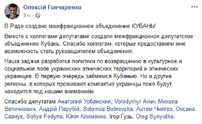 Ранее 17 октября стало известно о создании в раде межфракционного объединения, которое займется вопросами возвращения «в культурное, политическое, социальное поле украинских этнических территорий и этнических украинцев» Кубани. Также оно обратит внимание на другие территории компактного проживания в России этнических украинцев, заявил член фракции «Европейская солидарность» Алексей Гончаренко.