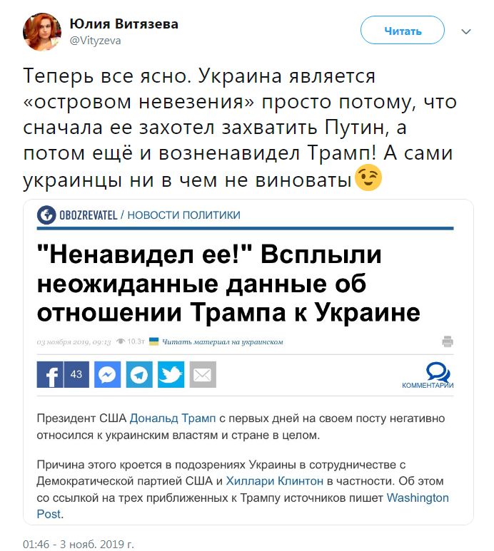 Теперь все ясно. Украина является «островом невезения» просто потому, что сначала ее захотел захватить Путин, а потом ещё и возненавидел Трамп! А сами украинцы ни в чем не виноваты.