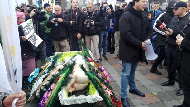 "Слуги народа" заблокировали трибуну в Раде, а под окнами свинью в гробу носили