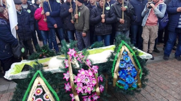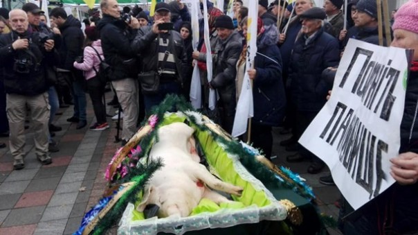 Участники акции протеста против принятия законопроекта о запуске рынка земли принесли под стены Верховной Рады тушу свиньи в гробу. Об этом сообщает Всеукраинская аграрная рада на своей странице в Facebook в среду, 13 ноября.