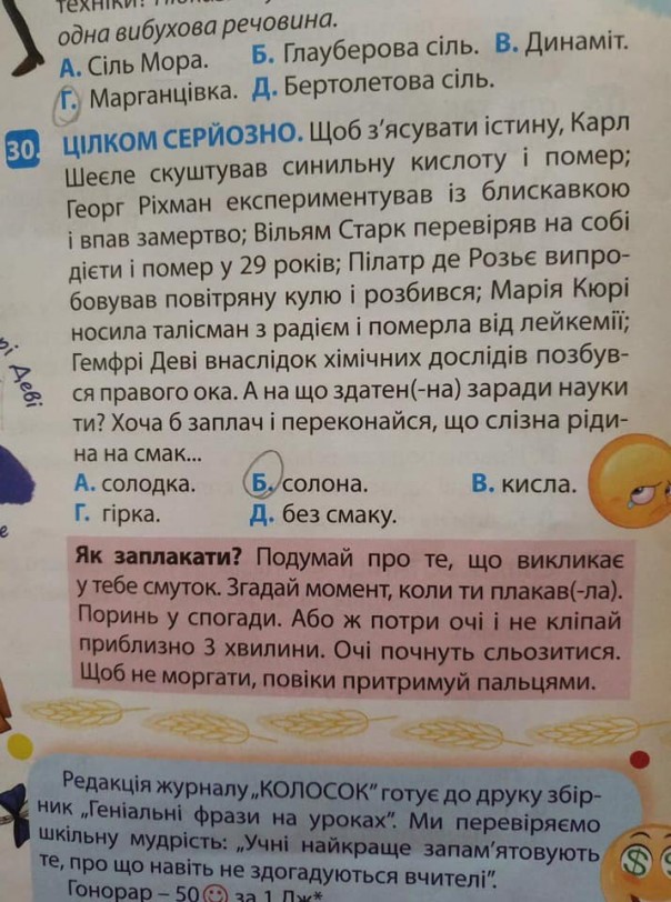 «Хотя бы заплачь и убедись, что капелька слезы на вкус…», – призывают авторы учебника, после чего предлагают детям выбрать варианты ответа о том, какой они считают слезинку – горькой, сладкой, соленой или безвкусной.