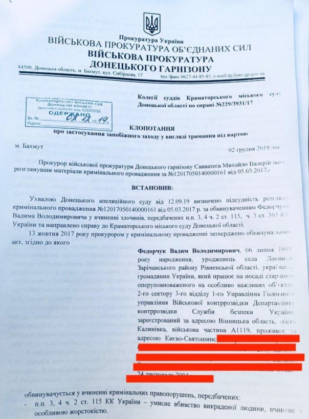 2 декабря 2019 года в Краматорский городской суд поступило ходатайство прокурора военной прокуратуры Донецкого гарнизона Михаила Савватеева об избрании меры пресечения сотруднику ВКР ДКР СБ Украины, майору СБУ Вадиму Федорчуку в виде содержания под стражей. На рассмотрение ходатайства закон отводит 72 часа. Такое же ходатайство вручено и самому майору-убийце Федорчуку.