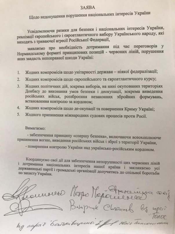 В связи с этим координируем свои действия для обеспечения нерушимости этих красных линий и соблюдения национальных интересов нашего государства, и призываем все государственные партии и общественные организации присоединиться для общей борьбы по защите Украины.