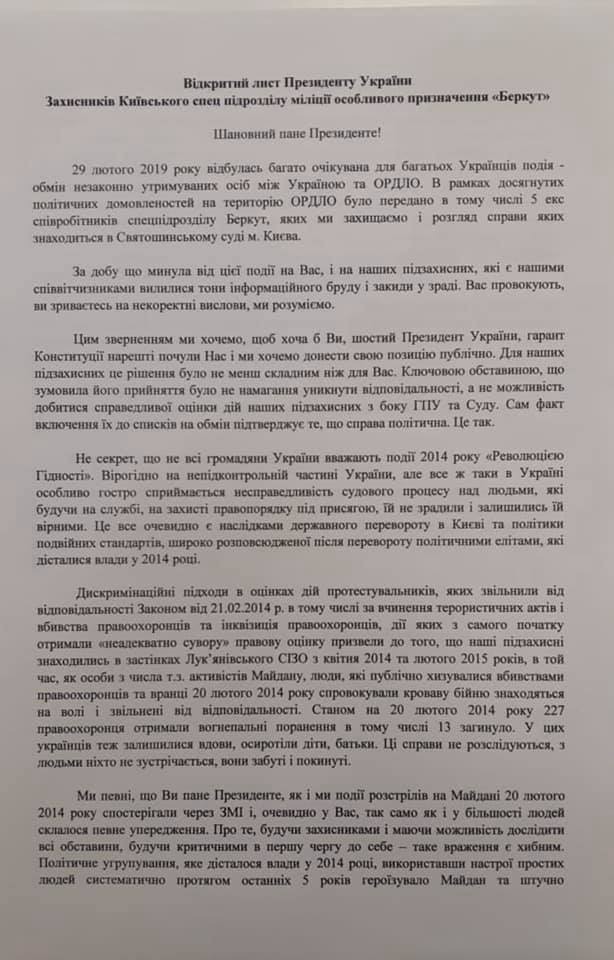 Этим обращением мы хотим, чтобы хотя бы Вы, шестой президент Украины, гарант Конституции наконец услышали нас. И мы хотим донести свою позицию публично. Для наших подзащитных это решение было не менее сложным, чем для Вас. Ключевым обстоятельством, обусловившим его принятие, было не попытка уйти от ответственности, а невозможность добиться справедливой оценки действий наших подзащитных со стороны ГПУ и суда. Сам факт включения их в списки на обмен подтверждает то, что дело политическое. Это так.