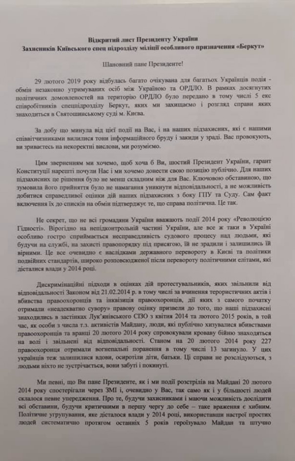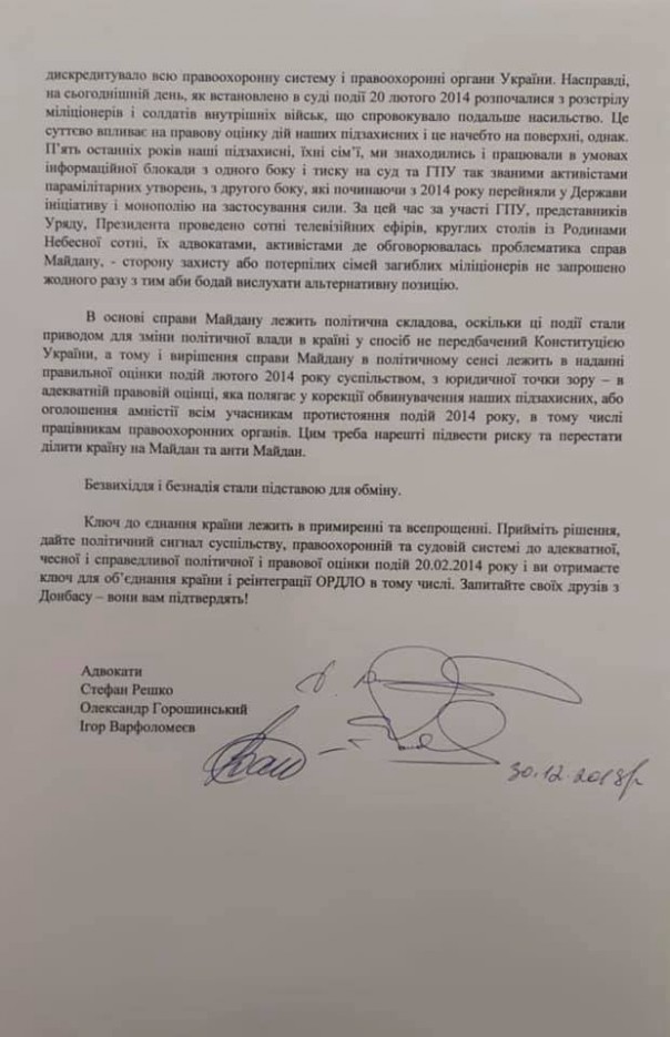 Мы уверены, что Вы, господин президент, как и мы, события расстрелов на Майдане 20 февраля 2014 наблюдали через СМИ и, очевидно, у Вас, так же как и у большинства людей, сложилось определенное предубеждение. Однако, будучи защитниками и имея возможность исследовать все обстоятельства, будучи критичными в первую очередь к себе - такое впечатление ошибочно. Политическая группировка, которая дорвалась до власти в 2014 году, использовав настроения простых людей, систематически в течение последних 5 лет героизировала Майдан и искусственно дискредитировала всю правоохранительную систему и правоохранительные органы Украины. На самом деле, на сегодняшний день, как установлено в суде, события 20 февраля 2014 г. начались с расстрела милиционеров и солдат внутренних войск, что спровоцировало дальнейшее насилие. Это существенно влияет на правовую оценку действий наших подзащитных и это вроде на поверхности. Однако пять последних лет наши подзащитные, их семьи, мы находились и работали в условиях информационной блокады с одной стороны и давления на суд и ГПУ так называемыми активистами парамилитарных образований, с другой стороны, которые, начиная с 2014 года переняли у государства инициативу и монополию на применение силы. За это время при участии ГПУ, представителей правительства, президента проведены сотни телевизионных эфиров, круглых столов с семьями Небесной сотни, их адвокатами, активистами, где обсуждалась проблематика дел Майдана. Сторону защиты или потерпевшие семьи погибших милиционеров не приглашали ни разу с тем, чтобы хотя бы выслушать альтернативную позицию.