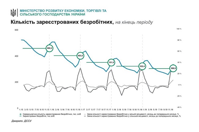 «Объяснение об 17% роста безработицы. Почему зрады нет, а есть перемога. На самом деле, безработица падает, а не растет. Если сравнивать уровень безработицы за 9 месяцев 2018 года и 2019 года, то он снизился на 0,5% — с 8,6 до 8,1 процентов. Но на днях в сети распространяли информацию, что показатель нетрудоустроенных лиц с ноября вырос на 17%, что совершенно не отражает общую тенденцию рынка труда. Почему? Посмотрите на график», — отметил министр.