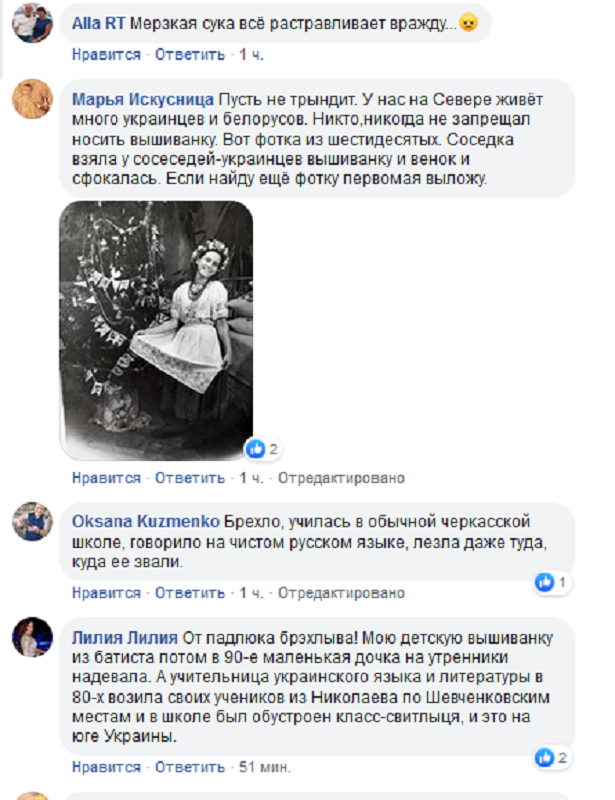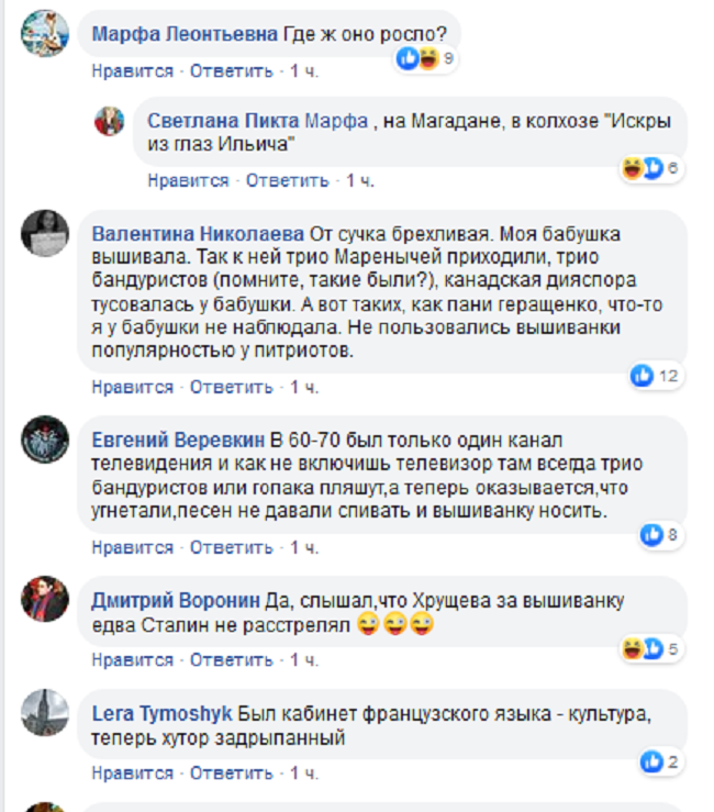 Вспомнили граждане Украины и о постоянных смотрах и конкурсах песни и танцев в украинских костюмах, и о уроках труда, на котором девочки учились вышивать крестиком украинские орнаменты и привели много фактов, отрицающих заявление Геращенко и добавили фото 70-80-х годов. Источник