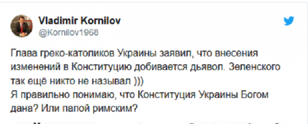 Политолог Владимир Корнилов на своей странице в микроблоге Twitter, комментируя слова главы Украинской греко-католической церкви (УГКЦ) Святослава Шевчука о том, что внесения изменений в Конституцию Украины добивается дьявол, отметил, что Зеленского так ещё никто не называл.