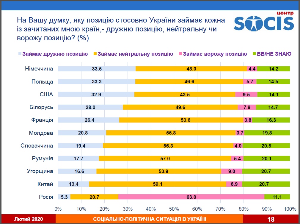 54,45% респондентов согласились с утверждением, что Россия это «агрессор, который угрожает существованию Украины», что Россия это «государство, от которого нужно защищаться, и не поддерживать никаких отношений».