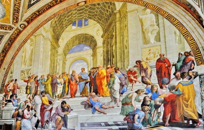 «Афинская школа» считается одним из величайших творений Ренессанса. В центре фрески изображены Аристотель и Платон. Их окружают другие философы Античности: Сократ, Парменид, Диоген, Пифагор, Гераклит, Евклид и Гипатия.