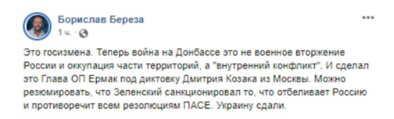 «Это госизмена. Теперь война на Донбассе — это не военное вторжение России и оккупация части территорий, а "внутренний конфликт". И сделал это Глава ОП Ермак под диктовку Дмитрия Козака из Москвы. Можно резюмировать, что Зеленский санкционировал то, что отбеливает Россию и противоречит всем резолюциям ПАСЕ. Украину сдали», - негодует экс-нардеп Борислав Береза.