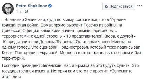 «Владимир Зеленский, судя по всему, согласился, что в Украине гражданская война. Ермак прямо выводит Россию из войны на Донбассе. Официальный Киев начнет прямые переговоры с террористами: с одной стороны - 10 представителей Киева, с другой - 10 представителей Донецка/Луганска. Остальные члены Минска по одному голосу. Это сценарий Приднестровья, который тоже подписывал Козак. Повторили с Украиной. Молдова в итоге осталась с позором и без территорий. Господин президент Зеленский! Вас и Ермака за это будуть судить. Это государственная измена. История вам этого не простит. "Запомните этот твит"», - пишет журналист Петр Шуклинов.