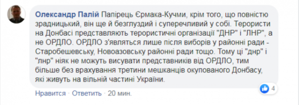 «Бумажонка Ермака-Кучмы, кроме того, что полностью предательская, она еще и бессмысленная и противоречивая в себе. Террористы в Донбассе представляют террористические организации "ДНР" и "ЛНР", а не ОРДЛО. ОРДЛО появятся только после выборов в районные советы - Старобешевский, Новоазовский районные советы и тому подобное. Поэтому эти "ДНР" и "ЛНР" никак не могут выдвигать представителей ОРДЛО, тем более без учета трети жителей оккупированного Донбасса, живущих на свободной части Украины», - заявил политолог Александр Палий.