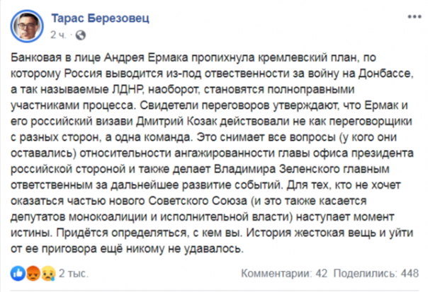 «Банковая в лице Андрея Ермака пропихнула кремлевский план, по которому Россия выводится из-под ответственности за войну на Донбассе, а так называемые ЛДНР, наоборот, становятся полноправными участниками процесса. Свидетели переговоров утверждают, что Ермак и его российский визави Дмитрий Козак действовали не как переговорщики с разных сторон, а одна команда. Это снимает все вопросы (у кого они оставались) относительности ангажированности главы офиса президента российской стороной и также делает Владимира Зеленского главным ответственным за дальнейшее развитие событий. Для тех, кто не хочет оказаться частью нового Советского Союза (и это также касается депутатов монокоалиции и исполнительной власти) наступает момент истины. Придётся определяться, с кем вы. История жестокая вещь и уйти от ее приговора ещё никому не удавалось», - заявил политолог Тарас Березовец, который обслуживает интересы бывшего президента Петра Порошенко.