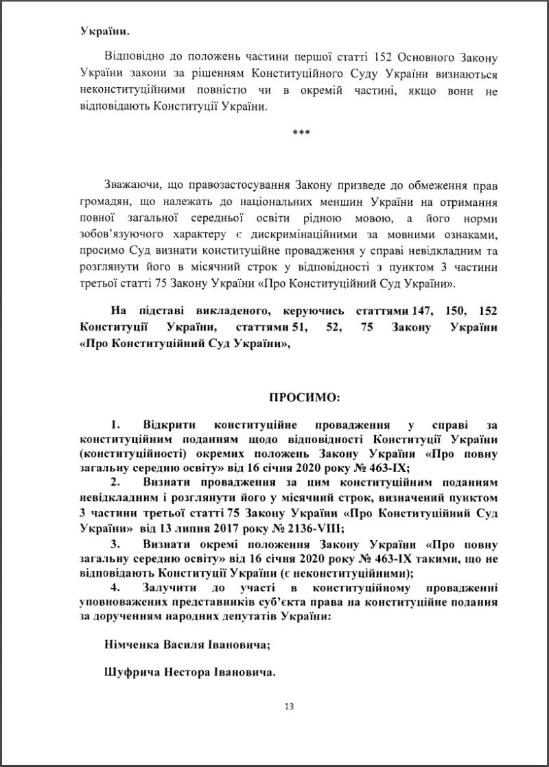 В тексте представления указывается, что претензия нардепов касается языковых моделей обучения для национальных меньшинств, так как, закон противоправно сужает существующие права на обучение на родном языке.