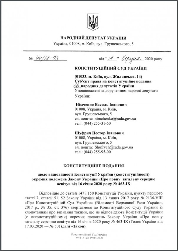 56 депутатов Верховной Рады во главе с Василием Нимченко и Нестором Шуфричем подали в Конституционный суд Украины (КСУ) представление о соответствии Конституции Украины отдельных положений закона № 463-ІХ «О среднем образовании».