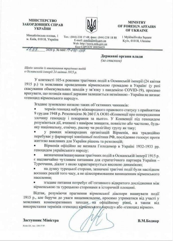 Всплыл тут один интересный документ, касающийся признания геноцида армянского народа в Османской Империи в 1915 году. Документ подписан заместителем министра иностранных дел Украины В.М. Бодиаром и в нём говорится «о неизменности украинской позиции по поводу признания геноцида армянского народа». Точнее – не признания. Потому что Украина этот геноцид не признавала, не признаёт и не собирается признавать. Конечно, Украина далеко не единственная страна в мире не признающая геноцид армян, но дело не в этом. Дело в том, что в документе прямым текстом были обозначены причины этого непризнания. А это – уж извините – какой-то вселенский позор.