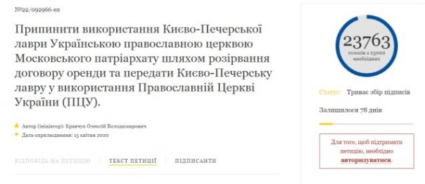 На сайте украинского президента за две недели практически закончен сбор подписей под петицией о прекращении использования Киево-Печерской лавры Украинской православной церковью Московского патриархата (УПЦ МП).