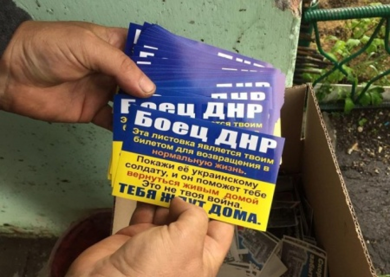 «Боец ДНР. Эта листовка является твоим билетом для возвращения в нормальную жизнь. Покажи ее украинскому солдату и он поможет тебе вернуться живым домой. Это не твоя война. Тебя ждут дома».