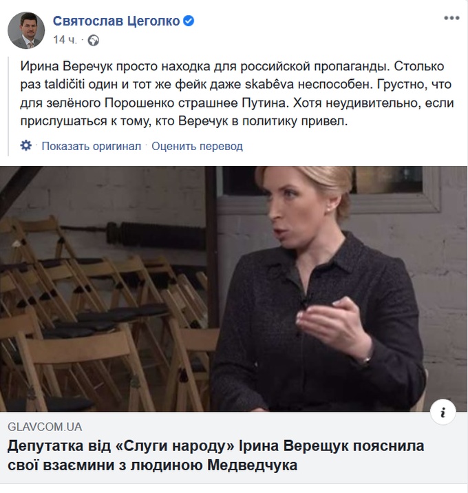«Ирина Верещук —э то просто находка для российской пропаганды. Столько раз талдычить один и тот же фейк даже Скабеева неспособна. Печально, что для зеленых Порошенко страшнее, чем Путин. Хотя и не удивительно, если учесть, кто привел Верещук в политику», — написал Цеголко сразу после эфира на своей странице в Facebook.