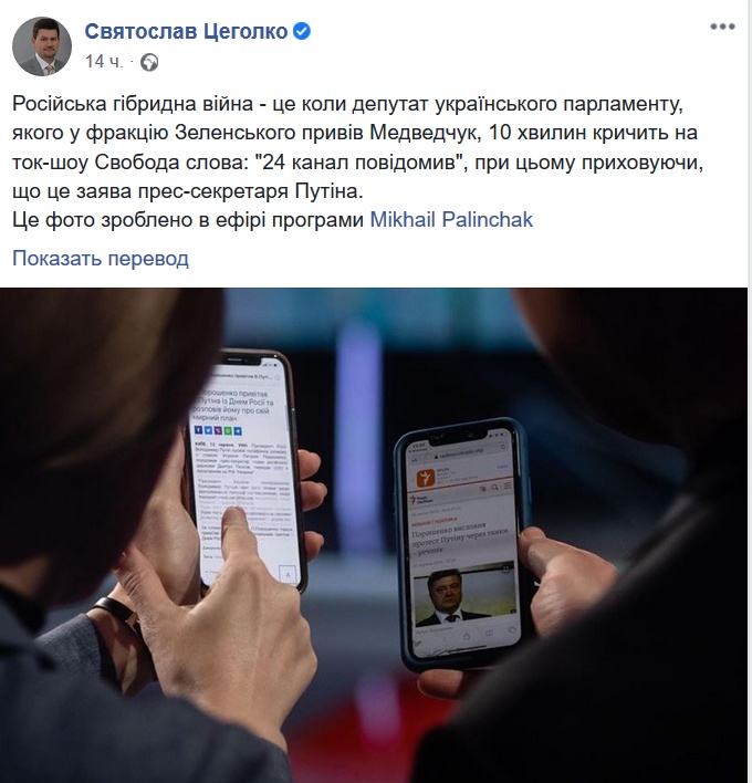 «Российская гибридная война — это когда депутат украинского парламента, которого во фракцию Зеленского привел Медведчук, 10 минут кричит на ток-шоу Свобода слова: «24 канал сообщил», при этом скрывая, что это заявление пресс-секретаря Путина».